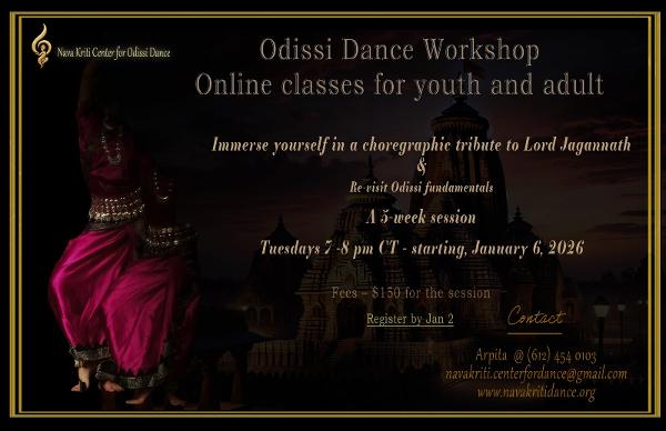 A 5 week course-Brush up your Odissi fundamentals and learn a pure Odissi choreographic piece. Session starting on Jan 6' 2026.