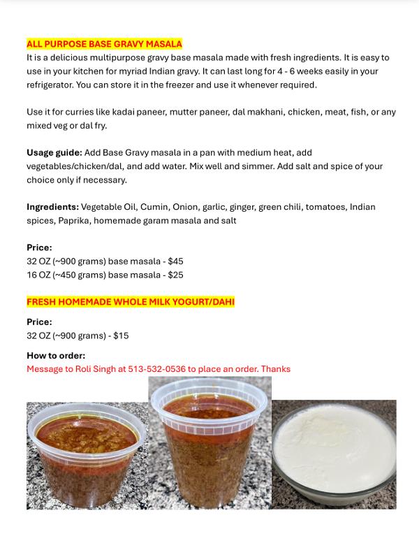 Message to Roli Singh at 513-532-0536 to place an order or email at msrolisingh@gmail.com. Thanks